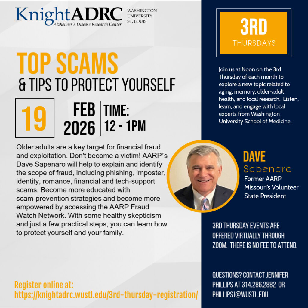 Registration Form 3rd Thursday Registration First Name: * Last Name: * Email * How did you hear about this event? * Address Address Street 1 Street 1 Street 2 Street 2 City City State/Province State/Province Zip/Postal Zip/Postal Country AfghanistanAland IslandsAlbaniaAlgeriaAmerican SamoaAndorraAngolaAnguillaAntarcticaAntigua and BarbudaArgentinaArmeniaArubaAustraliaAustriaAzerbaijanBahamasBahrainBangladeshBarbadosBelarusBelgiumBelizeBeninBermudaBhutanBoliviaBonaire, Sint Eustatius and SabaBosnia and HerzegovinaBotswanaBouvet IslandBrazilBritish Indian Ocean TerritoryBruneiBulgariaBurkina FasoBurundiCôte d'IvoireCambodiaCameroonCanadaCape VerdeCayman IslandsCentral African RepublicChadChileChinaChristmas IslandCocos (Keeling) IslandsColombiaComorosCongoCook IslandsCosta RicaCroatiaCubaCuracaoCyprusCzech RepublicDenmarkDjiboutiDominicaDominican RepublicEast TimorEcuadorEgyptEl SalvadorEquatorial GuineaEritreaEstoniaEthiopiaFalkland Islands (Malvinas)Faroe IslandsFijiFinlandFranceFrench GuianaFrench PolynesiaFrench Southern TerritoriesGabonGambiaGeorgiaGermanyGhanaGibraltarGreeceGreenlandGrenadaGuadeloupeGuamGuatemalaGuernseyGuineaGuinea-BissauGuyanaHaitiHeard Island and McDonald IslandsHoly SeeHondurasHong KongHungaryIcelandIndiaIndonesiaIranIraqIrelandIsle of ManIsraelItalyJamaicaJapanJerseyJordanKazakhstanKenyaKiribatiKosovoKuwaitKyrgyzstanLaosLatviaLebanonLesothoLiberiaLibyaLiechtensteinLithuaniaLuxembourgMacaoMacedoniaMadagascarMalawiMalaysiaMaldivesMaliMaltaMarshall IslandsMartiniqueMauritaniaMauritiusMayotteMexicoMicronesiaMoldovaMonacoMongoliaMontenegroMontserratMoroccoMozambiqueMyanmarNamibiaNauruNepalNetherlandsNew CaledoniaNew ZealandNicaraguaNigerNigeriaNiueNorfolk IslandNorth KoreaNorthern Mariana IslandsNorwayOmanPakistanPalauPalestinePanamaPapua New GuineaParaguayPeruPhilippinesPitcairnPolandPortugalPuerto RicoQatarReunionRomaniaRussiaRwandaSaint BarthelemySaint Helena, Ascension and Tristan da CunhaSaint Kitts and NevisSaint LuciaSaint Martin (French part)Saint Pierre and MiquelonSaint Vincent and the GrenadinesSamoaSan MarinoSao Tome and PrincipeSaudi ArabiaSenegalSerbiaSeychellesSierra LeoneSingaporeSint Maarten (Dutch part)SlovakiaSloveniaSolomon IslandsSomaliaSouth AfricaSouth Georgia and the South Sandwich IslandsSouth KoreaSouth SudanSpainSri LankaSudanSurinameSvalbard and Jan MayenSwazilandSwedenSwitzerlandSyriaTaiwanTajikistanTanzaniaThailandTimor-LesteTogoTokelauTongaTrinidad and TobagoTunisiaTurkeyTurkmenistanTurks and Caicos IslandsTuvaluUgandaUkraineUnited Arab EmiratesUnited KingdomUnited StatesUnited States Minor Outlying IslandsUruguayUzbekistanVanuatuVatican CityVenezuelaVietnamVirgin Islands, BritishVirgin Islands, U.S.Wallis and FutunaWestern SaharaYemenZambiaZimbabwe Country Our 3rd Thursday lectures cover a new topic each month. Are there topics related to aging, memory, and older-adult health, that you would like to learn more about? Would you like to be contacted to learn more about memory and aging research at Washington University? Yes No Register for Event